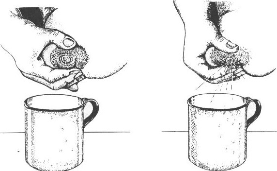 Estimular los pezones *Masaje suave en los pechos en dirección al pezón desde la periferia, como si se peinara el pecho. Se puede emplear un peine o peineta de púa muy fina para realizar este masaje. *Un masaje en la espalda realizado por otra persona, siguiendo la columna vertebral a ambos lados, realizando movimientos circulares al lado de cada vértebra. Si no es posible contar con ayuda, se puede dar un automasaje aprovechando el quicio de una puerta, buscando el hueco a izquierda y derecha de la columna vertebral. *El masaje estimula el reflejo de Oxitocina. *Colocar la mano en el pecho, para la mayoría de las mujeres es más cómodo con el pulgar encima y los otros dedos debajo. Cuando el pecho es grande, puede ser más fácil con una mano encima de la areola y la otra debajo *La zona que hay que apretar está sobre los senos galactóforos, (las dilataciones de los conductos principales donde se acumula la leche). Los senos galactóforos están a unos 3 centímetros de la base del pezón, lo que no siempre coincide con el borde de la areola. *Colocar el pulgar encima y los dedos debajo del pezón formando una letra ”C” con la mano como indica el dibujo. *Y presionar hacia dentro, hacia la cavidad torácica y hacia fuera de la misma y después presionar por detrás del pezón y la areola, juntando el dedo pulgar con los otros dedos. *Se repiten rítmicamente estos movimientos: *Hacia el tórax, hacia fuera y juntar los dedos, hacia dentro, hacia fuera y juntar los dedos. *Se recorren los cuatro cuadrantes de la mama, para vaciar todos los senos. Esto no debe doler; si duele, la técnica no es buena.
